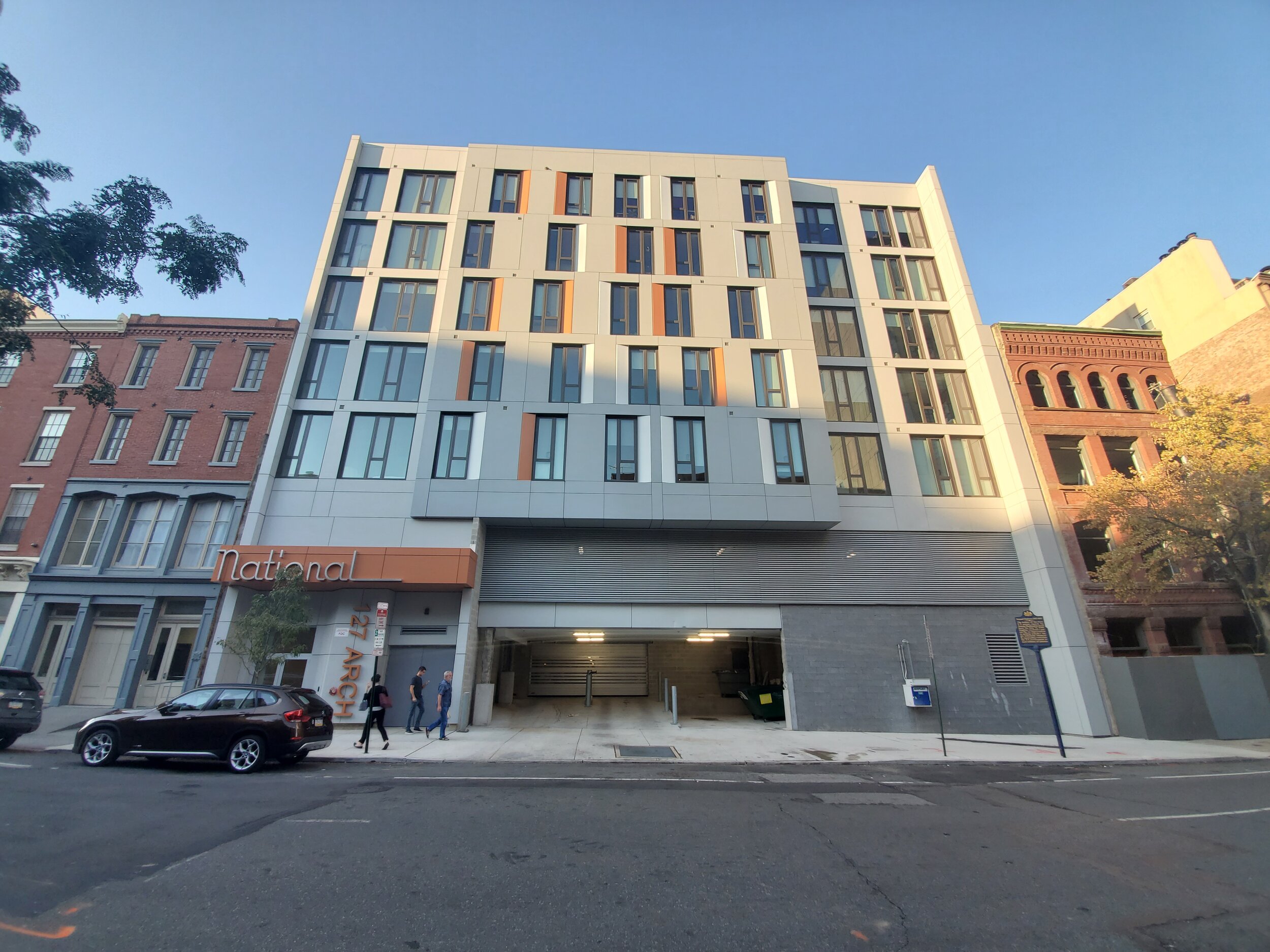 Apartments in Old City built over the reconstructed historic façade of The National china factory. The site is adjacent to the the oldest residential street in the United States, Elfreth’s Alley. thenationaloldcity.com